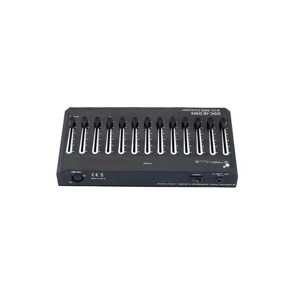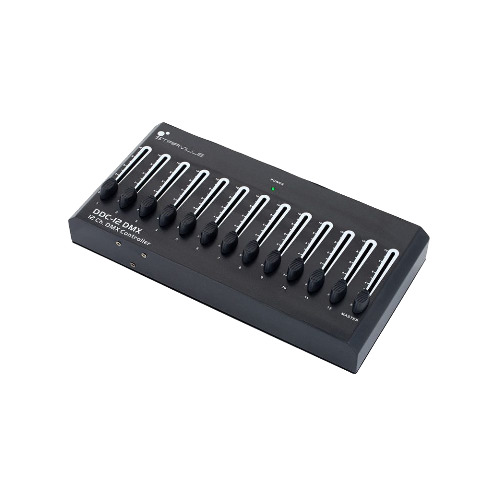 12 Channel mixer with master faderCompact design and simple operationPower input: DC 9 VDMX Ouput 3-pin XLRDimensions (W x H x D): 301 x 65 x 155 mmWeight: 1.2 kg